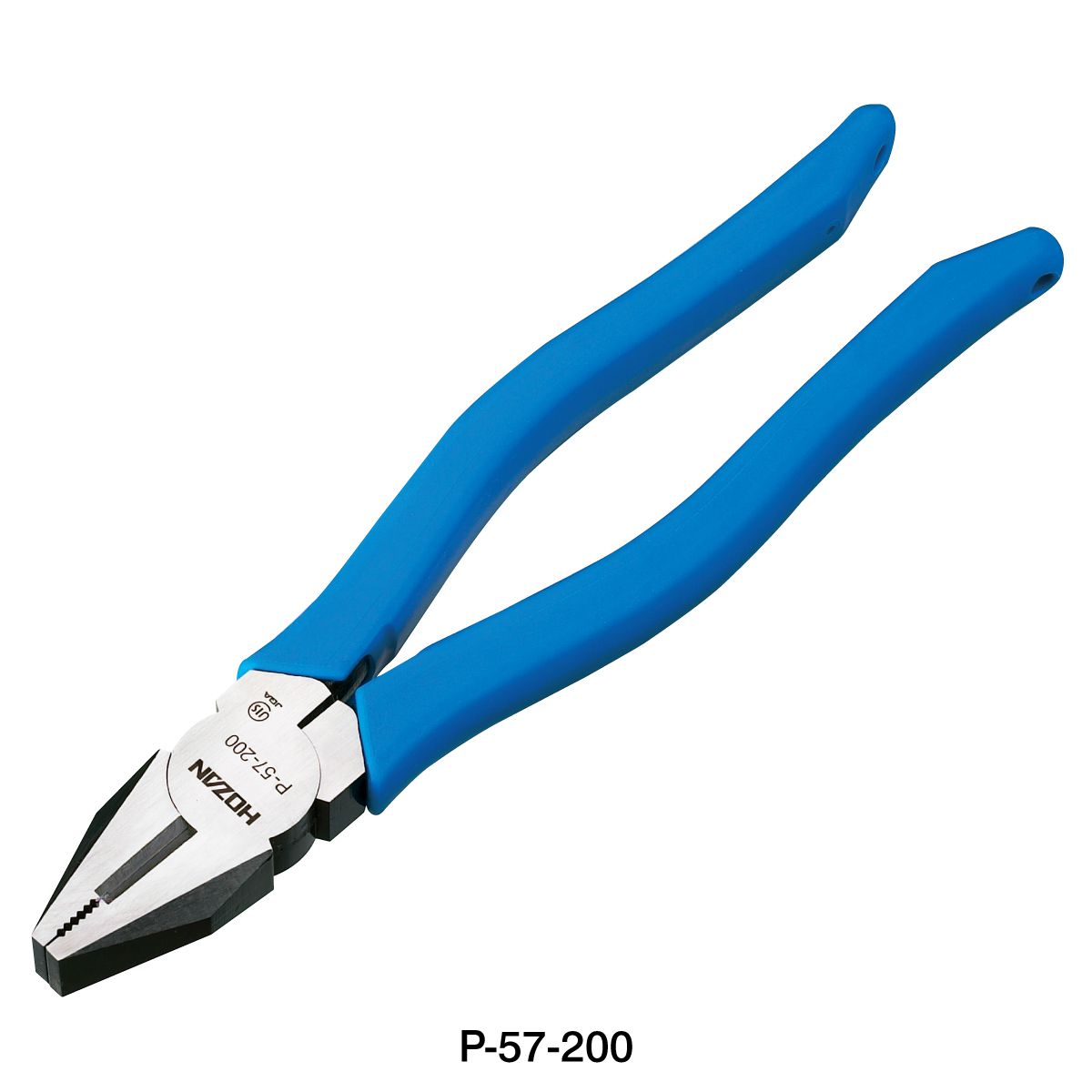 P-57 LINEMAN'S PLIERSCUTTERPart no.Cutting capacityHardnessHRC(blade)WeightgCopper wiremmφCopper strandedwiremm2VVFmmP-57-1753.55.51.6 × 3 wires61270P-57-2004.02.0 × 3 wires370Warning●The handle cover is not insulated. Do not use where electrical currents exist.