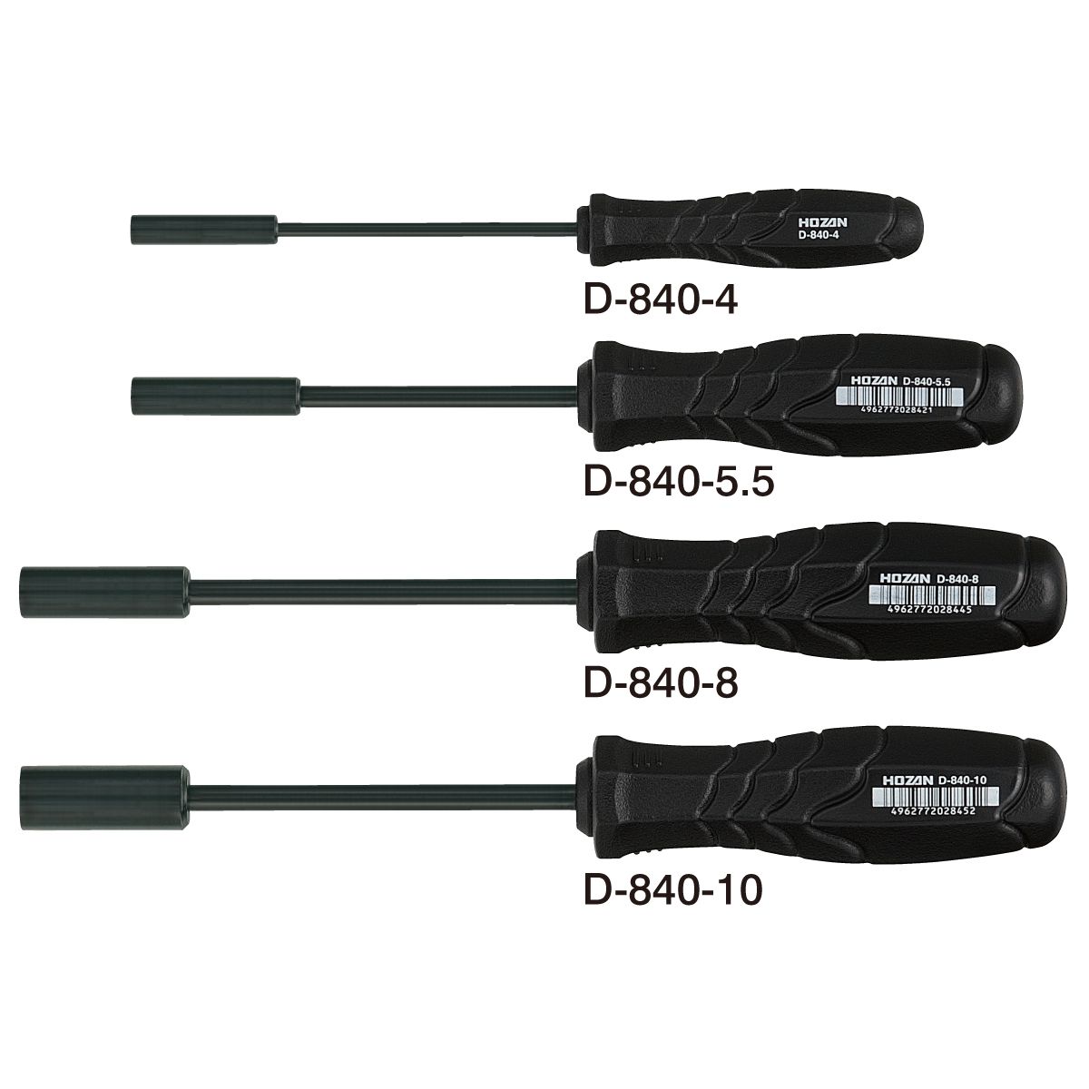 Part no.Width-across-flatsmmOALmmBlade lengthmmBlade diametermmφHandle diametemmφBox dia.mmφBox depthmmCompatible nutsWeightgD-840-44178100419.87.018M229D-840-55200530.08.0M2.562D-840-5.55.59.0M364D-840-7722512511.0M476D-840-88235633.512.0M4.5 / M5102D-840-101014.0M6109