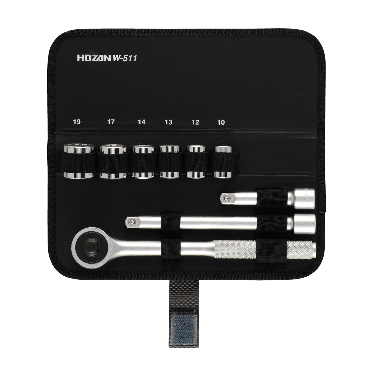 W-511SOCKET WRENCH SET ●Even deeply recessed areas can be reached by using the extension bar with the ratchet handle.Socket size9.5 mm square(3 / 8" sq)Pouch dimensions230 × 90 × 45 mmWeight880 gSet contentsRatchet handle9.5 mm squareExtension bar75 mm150 mmSocket(9.5 mm square)10 mm12 mm13 mm14 mm17 mm19 mmWarning●Do not use where electrical currents exist.